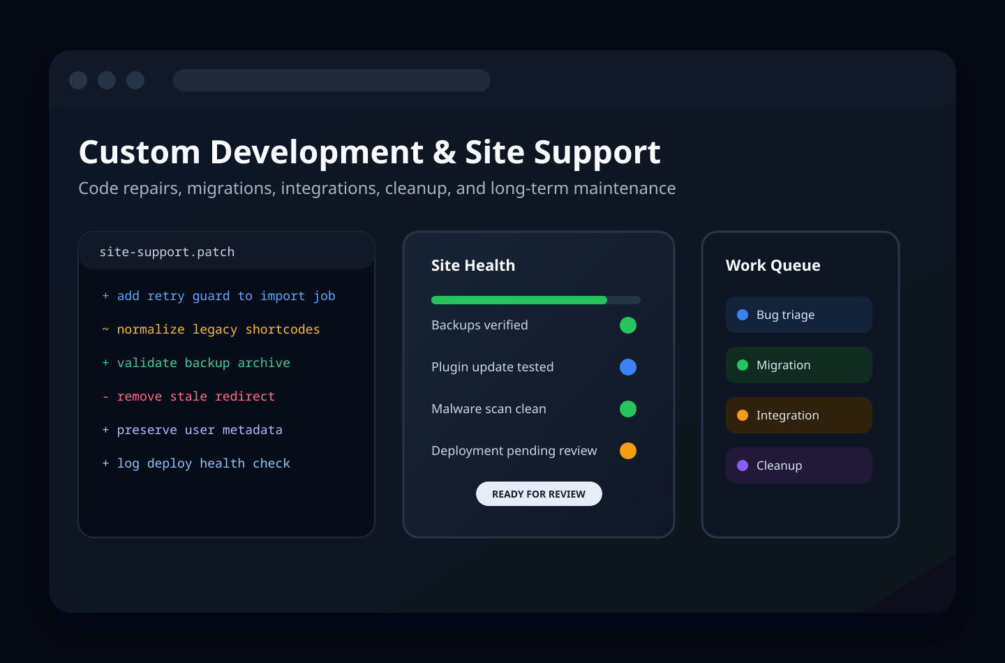 This entry represents the broader body of custom development and site support work behind many of the individual case studies on this site. It includes custom plugins, theme customization, WordPress repairs, malware cleanup, bug fixing, migrations, server troubleshooting, integrations, and ongoing maintenance for sites that need to stay stable over time instead of just looking finished at launch.